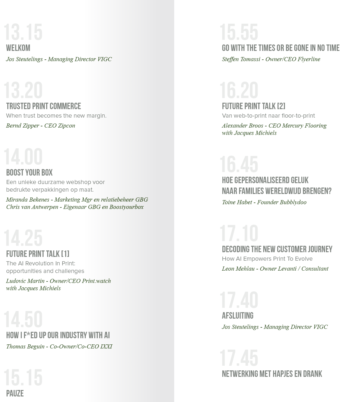 Dit eendaagse event geeft een helder beeld van hoe Online Print zich de volgende jaren ontwikkelt. De focus ligt op nieuwe manieren van werken, veranderende klantverwachtingen en het toenemende belang van print-on-demand. Print neemt daarbij een duidelijke rol in als kwalitatief, tastbaar eindproduct binnen een digitale beleving. De verschillende sessies met internationale sprekers laten zien hoe bedrijven hierop kunnen inspelen met toekomstgerichte strategieën en rendabele verdienmodellen.