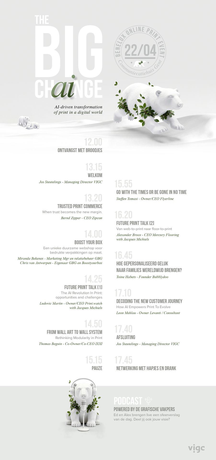 Dit eendaagse event geeft een helder beeld van hoe Online Print zich de volgende jaren ontwikkelt. De focus ligt op nieuwe manieren van werken, veranderende klantverwachtingen en het toenemende belang van print-on-demand. Print neemt daarbij een duidelijke rol in als kwalitatief, tastbaar eindproduct binnen een digitale beleving. De verschillende sessies met internationale sprekers laten zien hoe bedrijven hierop kunnen inspelen met toekomstgerichte strategieën en rendabele verdienmodellen.